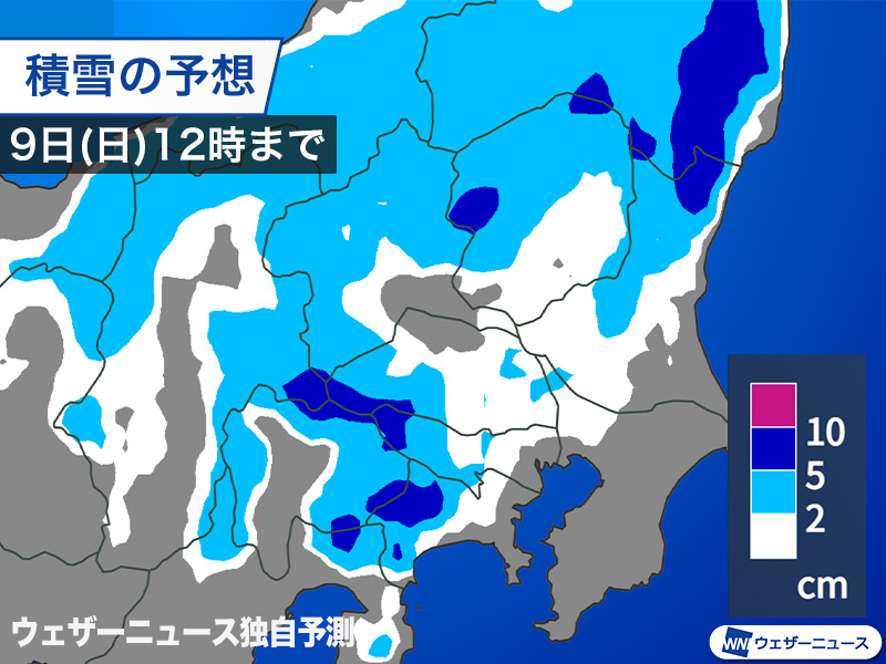 箱根から多摩西部、秩父にかけてや富士五湖周辺では湿った雪となり、路面に雪が積もるところもありそうです。標高の高いエリアでは凍結の心配もあり、車での移動を予定している場合は冬タイヤを装着してください。