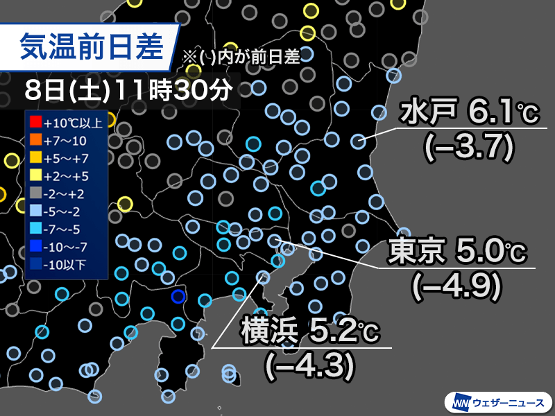 11時30分の気温は昨日の同じ時刻よりも低い所がほとんどで、一部では5℃前後も低くなっています。東京都心は4.9℃低い5.0℃、横浜市は4.3℃低い5.2℃、水戸市は3.7℃低い6.1℃です。