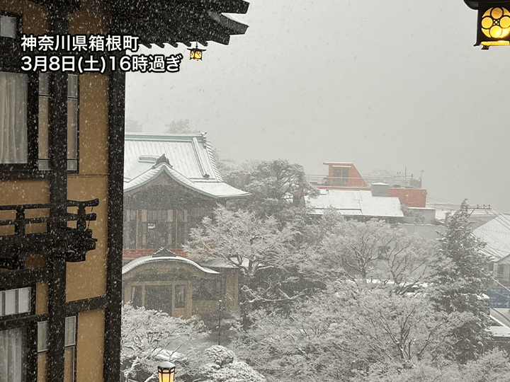 標高600mほどの箱根・小涌谷周辺では道路が真っ白で、車で走行する場合は冬用タイヤや滑り止めが必要な状況になっています。