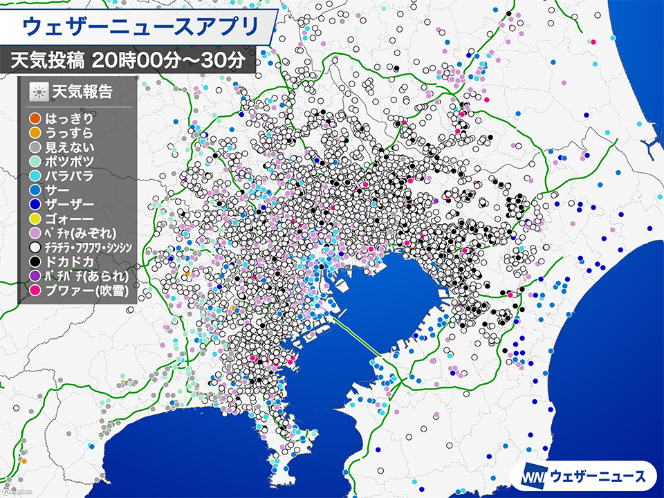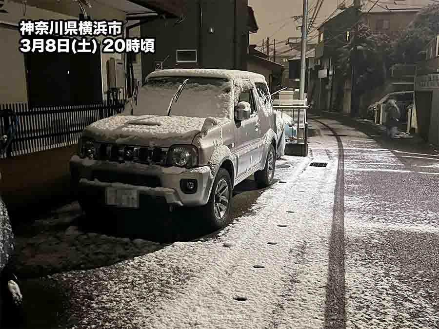 神奈川県や千葉県を中心に18時以降雪に変わる所が増えてきて、20時台は東京23区でもみぞれや雪になってきました。降雪のピークを迎えているものとみられます。