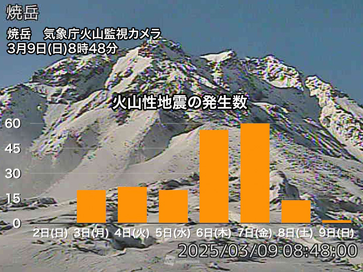 焼岳 火山性地震の多い状況続く 8日(土)には傾斜変動を観測