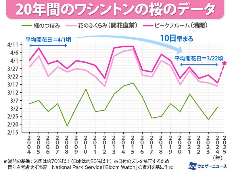 ウェザーニュースの独自予測では、ワシントンD.C.のソメイヨシノの満開日は3月30日の予想となりました。アメリカ国立公園局も、満開時期の予想は3月28日〜3月31日と発表しています。