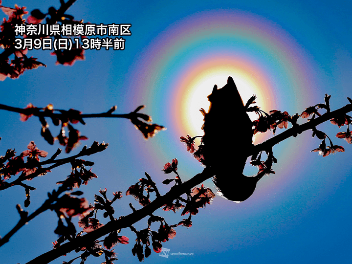 空中には多くの花粉が舞っているとみられ、花粉光環も出現しました。「花粉光環」とは、花粉の粒子によって太陽の光に回折・干渉が生じ、色が分かれて見える現象です。太陽の周囲を囲むように幾重にも虹色の環が現れるのが特徴で、花粉の飛散量が多いほどはっきりと見られます。