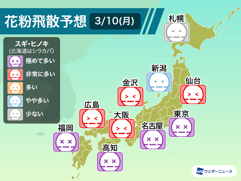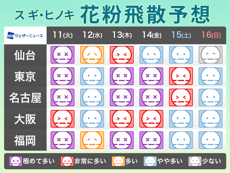 週末になると広範囲で雨予想となっているため、花粉の飛散もいったん落ち着くとみていますが、晴れる日や風も強い日は万全の対策が必要です。東北でも全域で花粉が飛びはじめ、飛散が本格化し始めた東北南部では"非常に多い〜極めて多い"予想の日もあります。