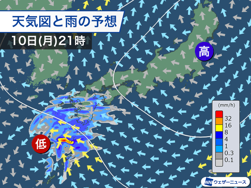 さらに東シナ海には低気圧が発生し、早い所では夕方から雨の降り出す可能性があります。低気圧が近づく夜にかけて雨の範囲は広がり、九州南部では本降りの雨、北部でも傘が必要なくらいの降り方にになる見通しです。