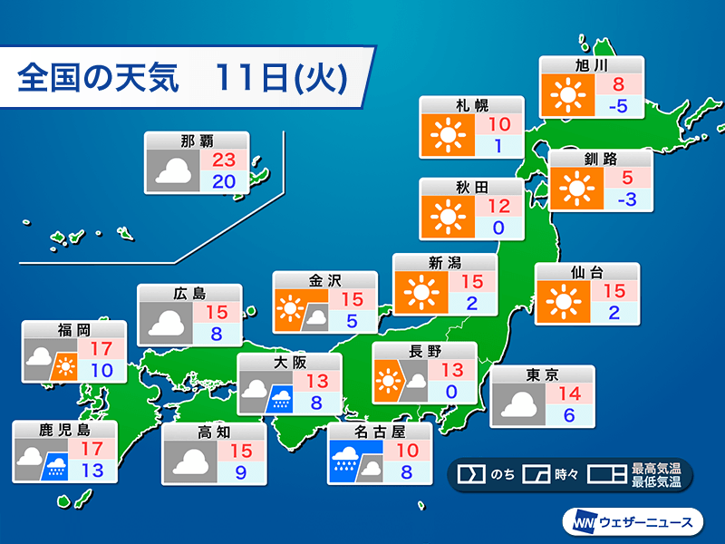 明日は西日本、東日本の太平洋側を中心に雲が広がり、一部で雨の降る所があるため気温が上がりにくくなります。大阪市の最高気温は13℃、名古屋市は10℃止まりで日差しもないため少し肌寒いかもしれません。