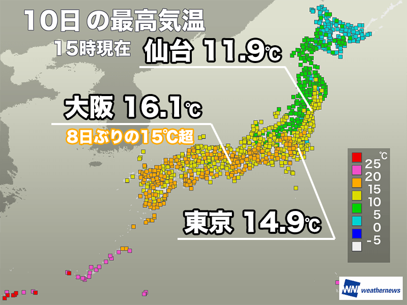 東京都心も14.9℃と昨日以上に気温が上がり、東北も仙台で11.9℃など太平洋側で10℃を超えています。
