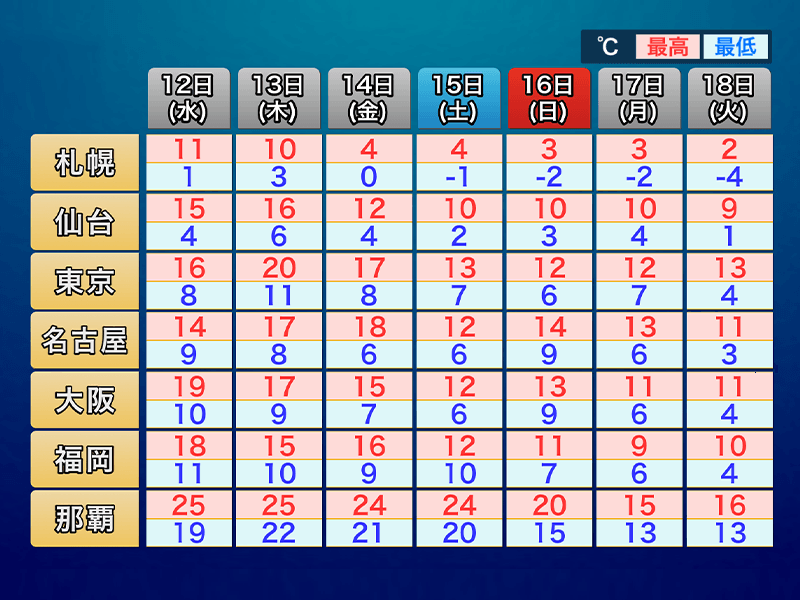 関東から西日本にかけては14日(金)頃まで気温が高く、東京都心は13日(木)に20℃の暖かさとなります。こちらは大きく天気が崩れる週末から気温が下がり、強い寒気が流れ込む17日(月)は福岡市の最高気温が9℃と冬に戻ったような寒さです。