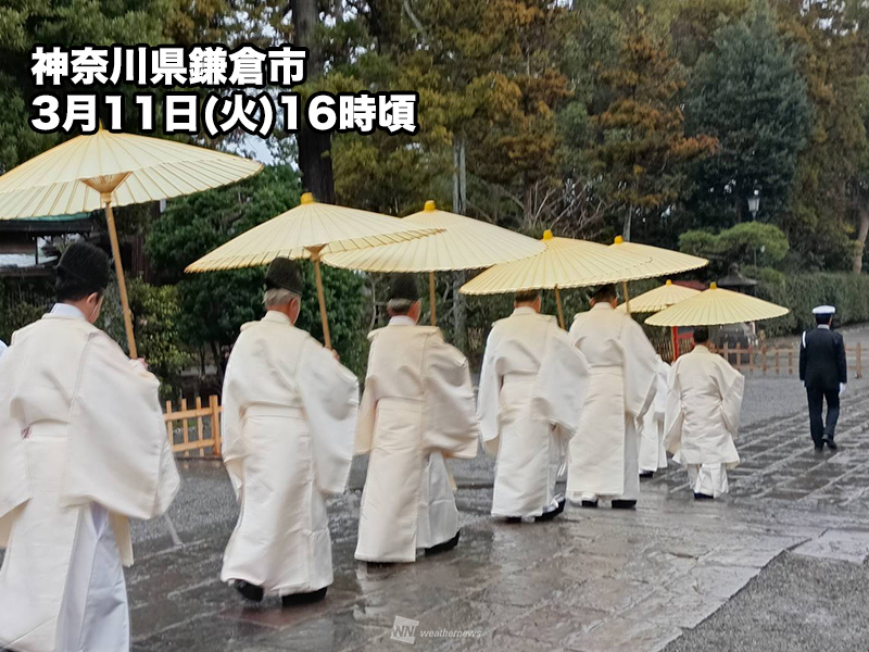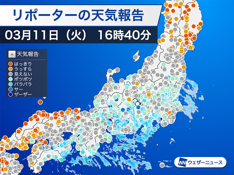 今日3月11日(火)は日本列島を覆っていた高気圧が東に離れ、九州の南を低気圧がゆっくりと東に移動しています。西日本や東日本に南から湿った空気が流れ込み、九州から東海の広範囲で朝から雨が降りました。