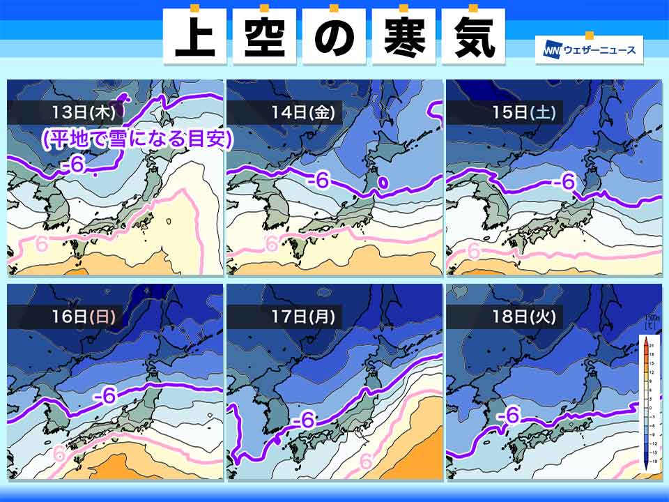 北日本では明後日14日(金)から寒気が流れ込みやすくなり、気温が下がります。札幌では来週前半にかけて最高気温が2℃くらいとなり、雪の降る日が多くなりそうです。関東から九州にかけても、日曜日は雨が降り肌寒くなります。特に関東甲信は気温が低くなり、山間部では雪の降る可能性があります。