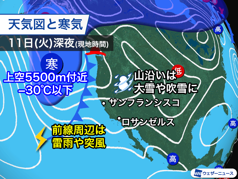 アメリカ西海岸を寒冷前線が通過 局地的に雨や雪が強まる
