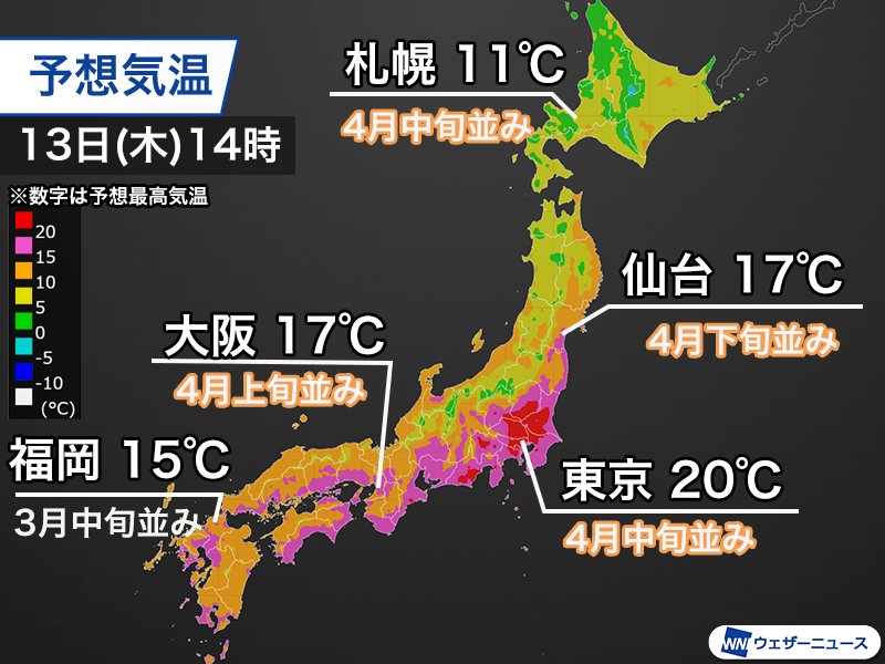 | 東京 | 20 ℃ | +6 | 4月中旬並 |
