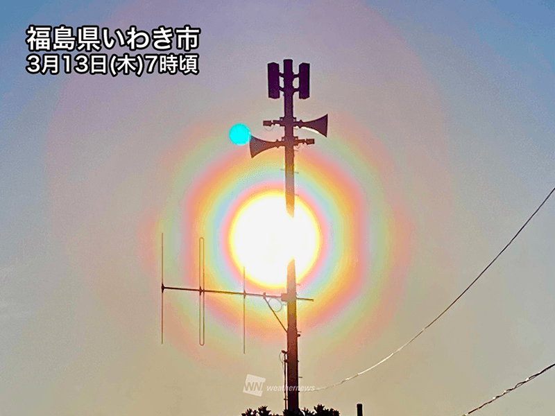 「花粉光環」とは、花粉の粒子によって太陽の光に回折・干渉が生じ、色が分かれて見える現象です。太陽の周囲を囲むように幾重にも虹色の環が現れるのが特徴で、花粉の飛散量が多いほどはっきりと見られます。