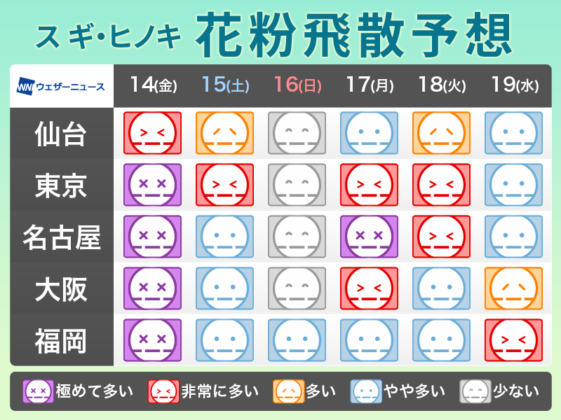 今日の花粉飛散予想 東京、名古屋、大阪は「極めて多い」予想