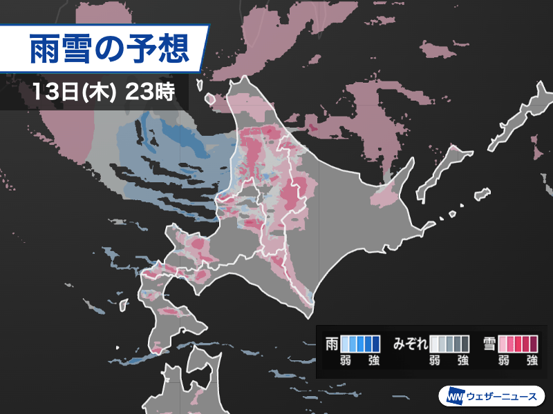 上空の寒気がまだ弱く、降るものは雨の所がほとんどになっています。斜里町宇登呂では10時20分までの1時間に13.0mmの雨を観測しました。この雨で融雪が進み、路面状態が悪くなっています。足もとに注意してください。