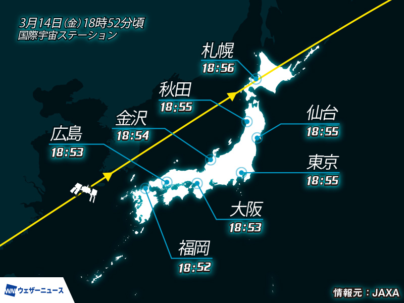 一方、それ以外の東日本や西日本の多くの地域では高気圧に覆われるため、晴れて観測できる見込みです。なお、本日14日(金)は今年3回目の満月となります。ISSと満月が同時に見られる美しい光景を楽しめるかもしれません。