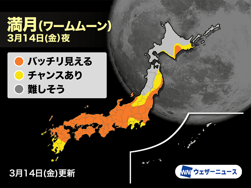 今夜は、北海道付近は冬型の気圧配置、西日本や東日本は高気圧に覆われます。このため九州〜東北南部の各地では晴れて満月の見られるところが多くなる予想です。