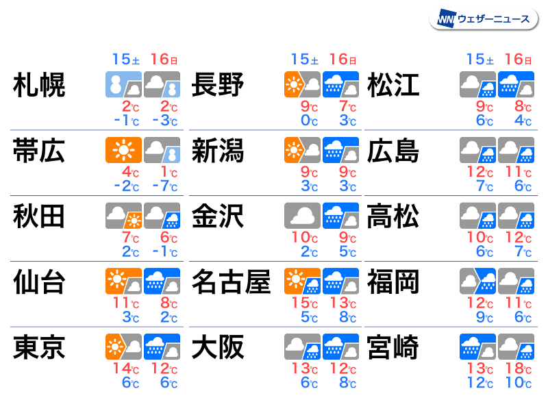 一方、北からは冷たい空気が流れ込みます。気温はそれほど上がらず、最高気温は東京都心や大阪で12℃、福岡で11℃、金沢では9℃の予想です。冷たい雨になるため、防寒が欠かせません。