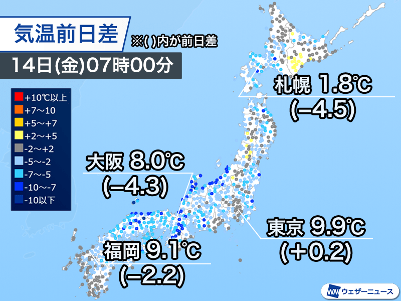 7時時点の気温は、大阪では8.0℃(前日比−4.3℃)、名古屋では6.4℃(−3.8℃)、福岡では9.1℃(−2.2℃)でした。東京は9.9℃(+0.2℃)と昨日と同じくらいでした。