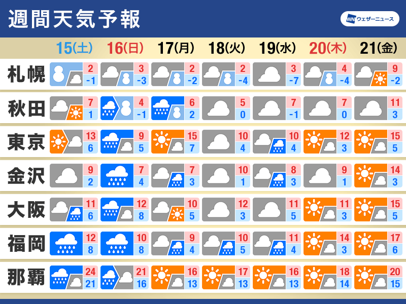 明日15日(土)から週明け17日(月)にかけて、低気圧が本州南岸付近を北東へ進むため、西日本から次第に天気が崩れる見込みです。