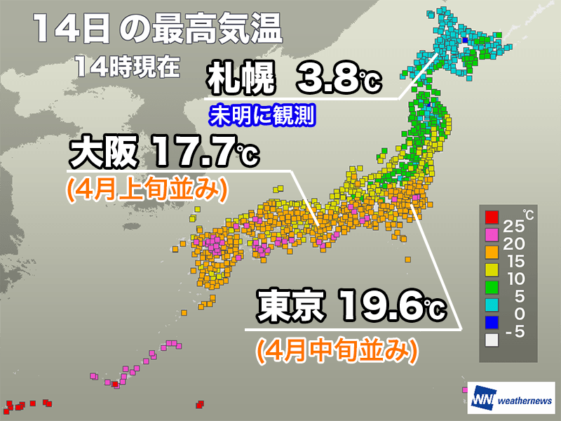 今日14日(金)14時までの最高気温は、福岡19.2℃、高知20.6℃、大阪17.7℃、名古屋19.4℃、東京19.6℃です。九州から関東にかけては朝は肌寒く感じられましたが、昼間は20℃くらいまで上がったところが多く昨日と同じくらいになっています。各地で春らしい陽気となり、日差しの下ではかなり暖かく感じられました。