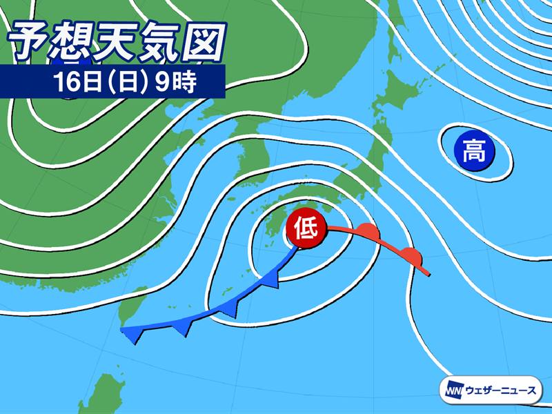 16日(日)は低気圧に近い太平洋側を中心に、強い雨や落雷の可能性があり、低気圧の発達状況によっては大雨となることも考えられます。