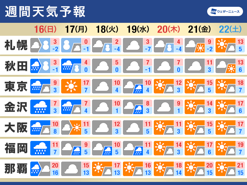 日曜日は広範囲で荒天のおそれ 来週は冬の寒さに逆戻り