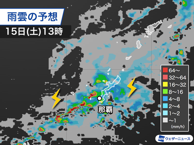 今日15日(土)の南西諸島は、前線に南から暖かく湿った空気が流れ込むため、前線周辺で雨雲が発達しやすい状況です。
