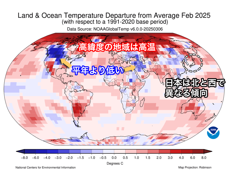 地域ごとの違いは大きく、ロシアなど北半球の高緯度の地域で平年を大幅に上回りました。その一方でアメリカ中部からカナダ西部は平年よりも大幅に低く、東ヨーロッパや中東、中国などは平年よりも低くなっています。