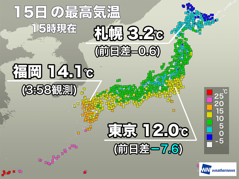 九州や中国地方では未明から朝にかけて最高気温を記録した所が多く、福岡市の14.1℃は3時58分、広島市の12.6℃は1時00分の観測です。関東や東北も昨日ほどは気温が上がらず、東京都心の最高気温は12.0℃と昨日に比べると7.6℃も低くなりました。