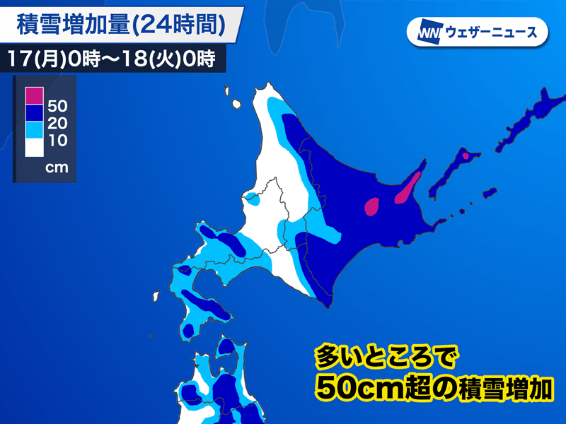 低気圧の接近に伴って今夜から北海道内でも雪のエリアが拡大します。低気圧に近い道東エリアでは発達した雪雲の流れ込みが続き、明日17日(月)は多い所で24時間に50cm以上の降雪がある予想です。