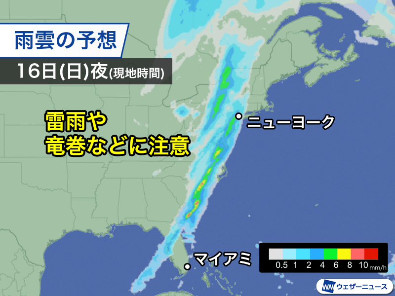 低気圧、前線に伴う活発な雨雲は東海岸を通過していて、嵐のピークは過ぎつつあるものの、現地時間の16日(日)いっぱいは激しい雷雨や竜巻などのおそれがあります。