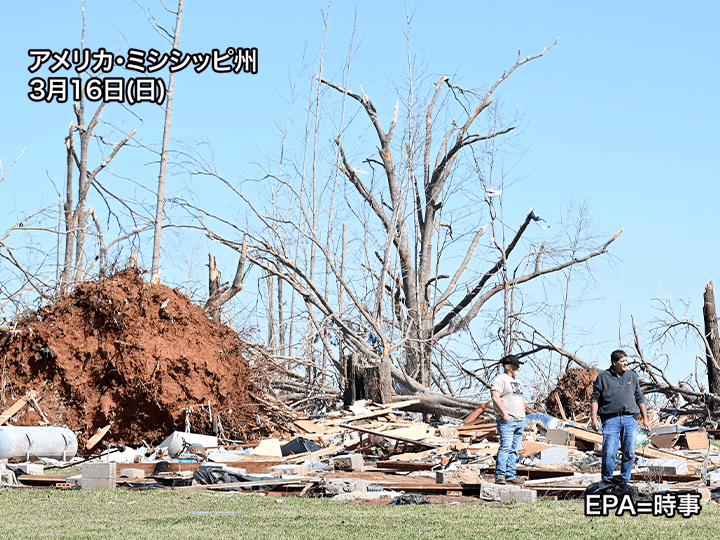低気圧の後ろ側には強い寒気を伴っていた一方で、メキシコ湾からは暖かく湿った空気が流れ込んでいます。大気の状態が非常に不安定となって雨雲が発達しました。発達した積乱雲の周辺では竜巻が発生し、気象当局に寄せられた竜巻の報告数は中部や南部を中心に14日(金)が46件、15日(土)は41件に達しています。