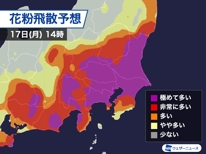 雨上がりで気温が上がると、花粉が飛散しやすくなります。特に、今日は西風が強いため、西側に山がある関東では花粉の飛散量が多くなる傾向です。広い範囲で最もランクの高い「極めて多い」予想になっています。