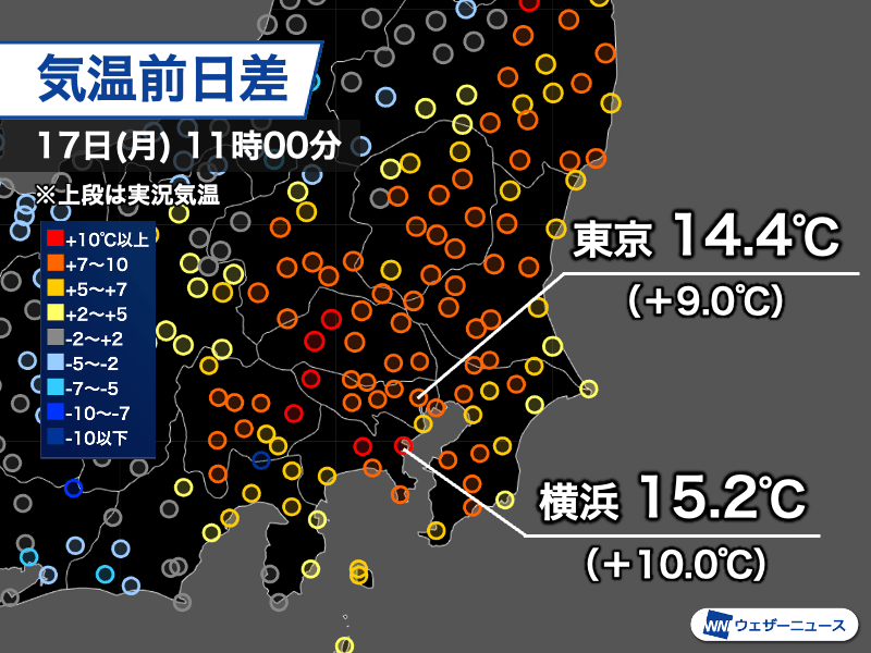 たっぷりの日差しで気温が急ピッチで上昇し、横浜市では10時10分に、東京都心では10時59分に15℃を突破しました。昨日の同時刻と比べると10℃近く高くなっています。また、11時00分までの横浜市の最高気温は15.8℃で、那覇市よりも高い状況です。この時期に那覇市よりも暖かくなるのは珍しいことです。