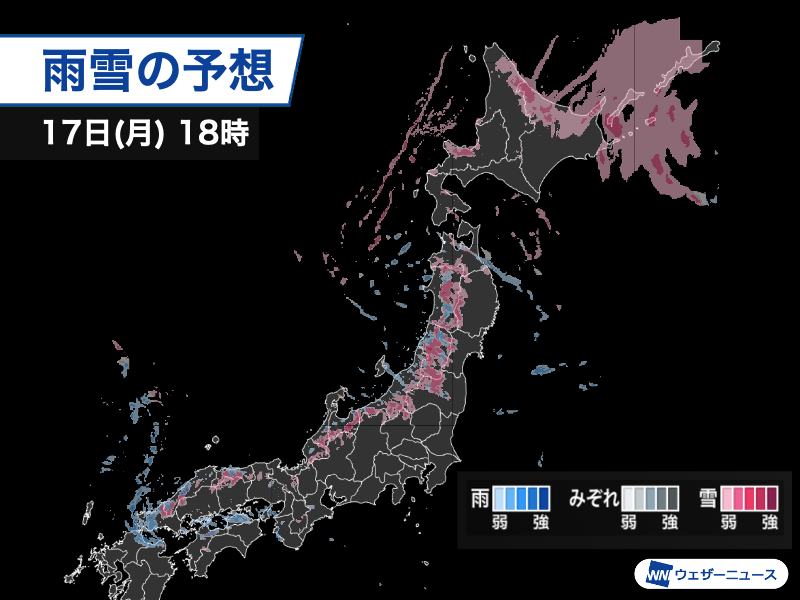 夜にかけて雨雲や雪雲は徐々に衰弱していく見込みですが、すっきり回復とはなりません。帰宅時間帯も折りたたみ傘が活躍します。