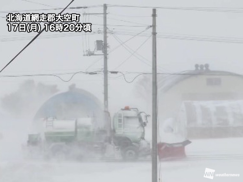 オホーツク海側道東の荒天は今夜いっぱい続くとみています。猛吹雪でホワイトアウト状態になることもありますので、不要不急の外出は控えてください。