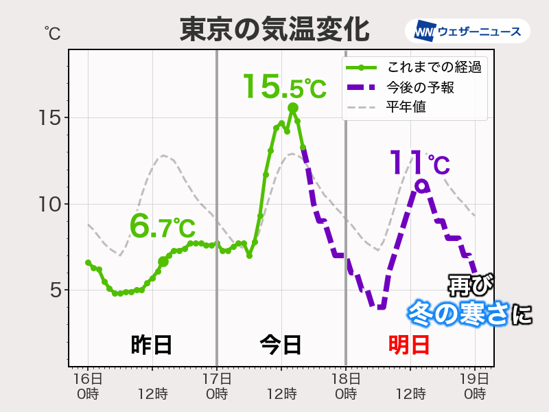 東京都心の気温変化を見ると、明日の朝は4℃まで気温が下がる見込みです。昼間は2月中旬並みの11℃までしか上がらず、今日に比べると5℃近く下がる予想になっています。