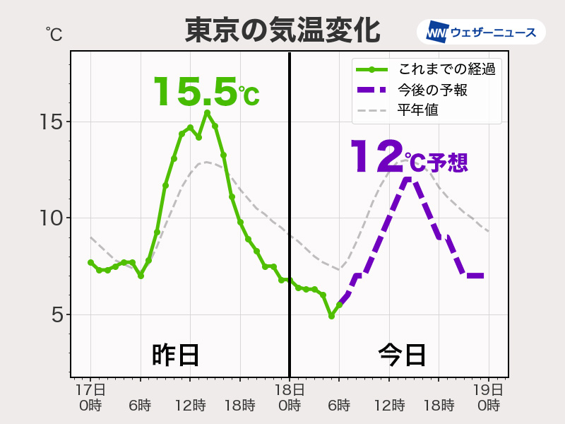 昼間も各地で昨日より気温が低く、冬のような寒さが戻るとみています。東京は2月下旬並みの12℃の予想です。