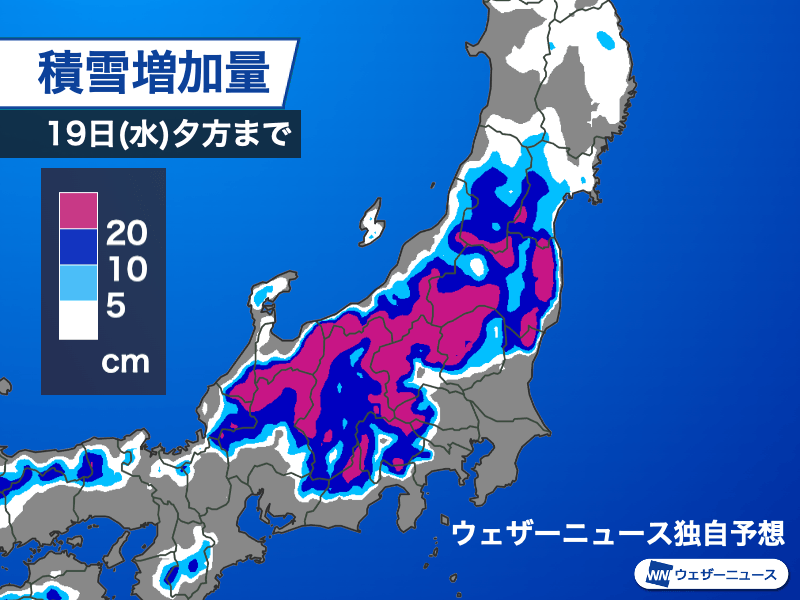 明日の夕方までに予想される積雪増加量は山沿いで20cm以上の所が多く、平野部でも宇都宮市などでは道路に積もる可能性があります。