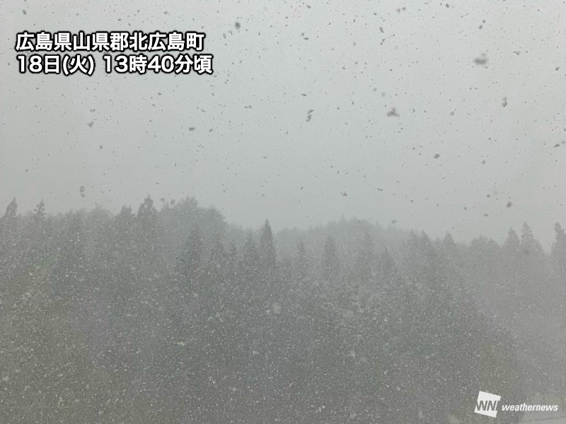 雪の目安とされる上空1500m付近の寒気も西回りで流れ込み、山沿いでは雪になっています。広島県北広島町八幡では14時までの1時間に7cmの雪が降りました。