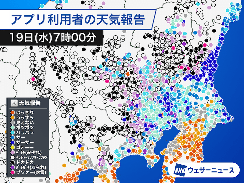 関東甲信では、昨夜から雨や湿った雪が降り始め、今日19日(水)の朝も雷を伴いながら降り続いています。