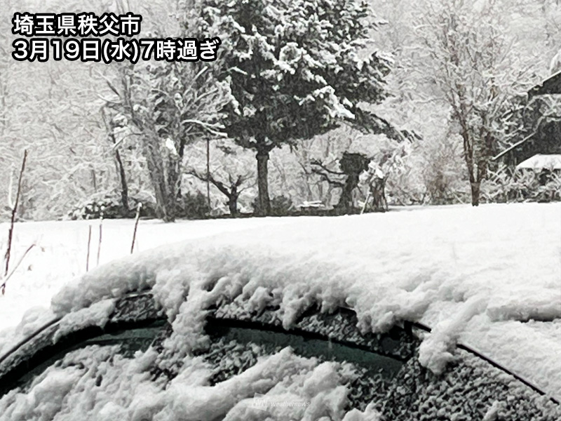 7時時点で0.4℃まで冷え込んでいる秩父では、積雪の報告が届いています。今回の雪は湿り気が多く、みぞれに近い状態ですが、気温がさらに下がれば道路にしっかりと積もるおそれがあります。