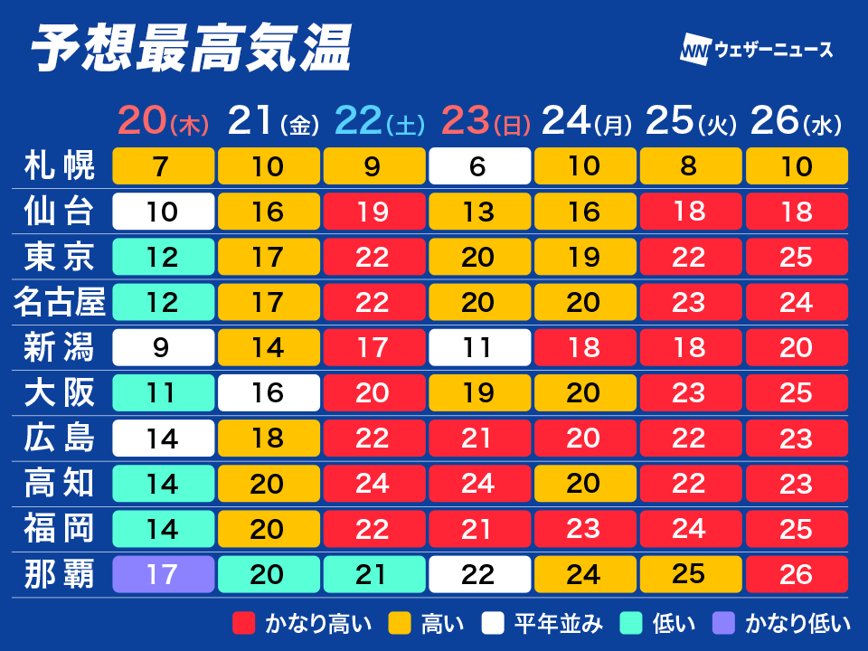 22日(土)の予想最高気温は仙台で19℃、東京で22℃、大阪で20℃、高知で24℃です。北日本の上空には断続的に寒気が流れ込んで気温のアップダウンがありますが、西日本や東日本では20℃前後の日が多くなり、局地的に25℃を上回る夏日となる地点もありそうです。本格的に春服の出番といえそうです。