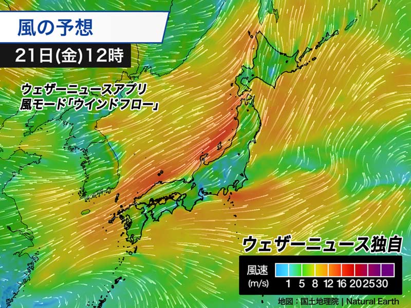 明後日21日(金)から23日(日)にかけて発達した低気圧がサハリン付近を通過します。本州南の移動性高気圧との気圧傾度が大きくなり、全国的に西風が強く吹く予想です。