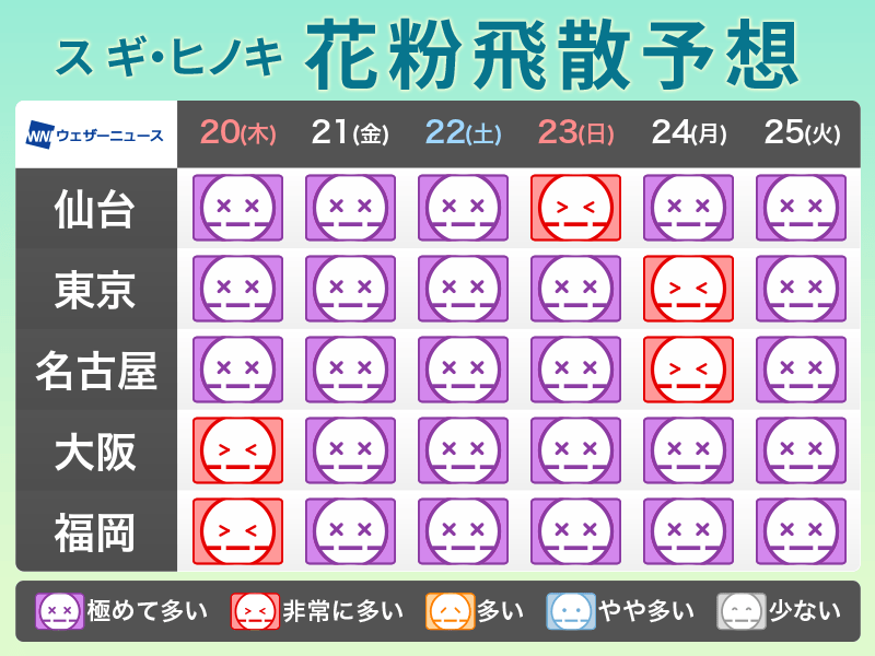 また、上空の寒気が退いて暖気が北上し、西日本や東日本を中心に春本番の暖かさとなります。東北~九州の全域で既にスギ花粉が本格的に飛散しており、強風と昇温という気象条件が揃うことによって大量の花粉が飛散するおそれがあります。