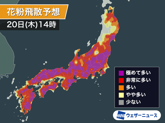 ウェザーニュース独自の花粉レーダーによる昼過ぎの予想を見ると、東北南部から九州にかけてのほとんどが“非常に多い”ランクの赤色となっていて、さらに飛散量の多い“極めて多い”ランクの紫色の領域も広く分布しています。今日は花粉の大量飛散に注意が必要です。