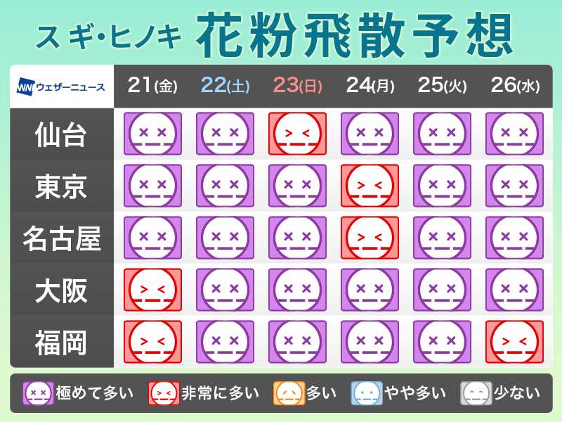 来週中頃にかけては気温がさらに上昇することに加えて、全国的に西風が強く吹く予想です。気温上昇と強風という気象条件が揃うことによって大量の花粉が飛散するおそれがあります。そのため“極めて多い”と最も多いランクが各地で予想されています。西日本から東日本では週末はお出かけ日和となりますが、万全の花粉症対策が必要です。