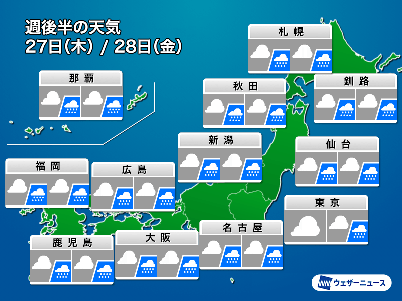 来週の前半は、雲の広がることはあっても晴れる日が多い見込みです。しかし、27日(木)には日本海から低気圧が接近します。27日(木)〜28日(金)にかけて、低気圧から伸びる寒冷前線が日本列島を通過する予想です。