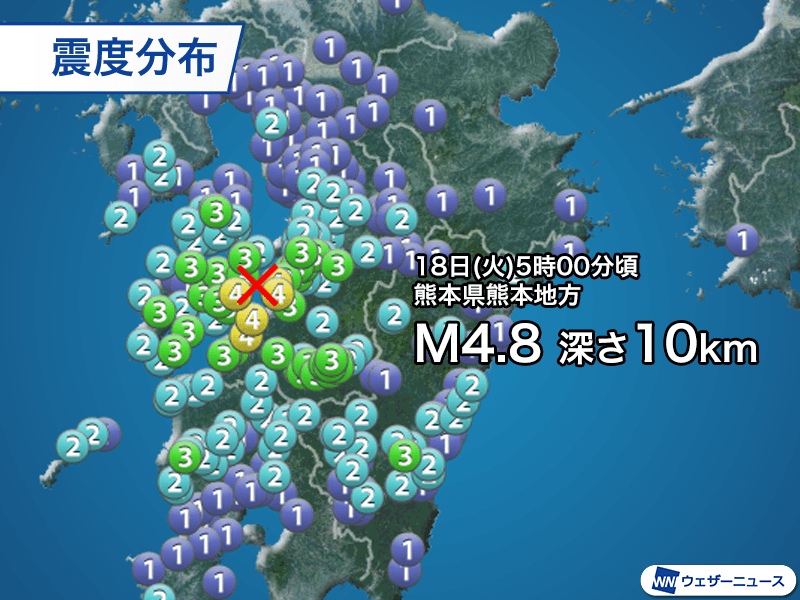 18日(火)5時00分頃、熊本県熊本地方を震源とするマグニチュード4.8、深さ10kmと推定される地震が発生しました。この地震で熊本県八代市、上天草市、芦北町で最大震度4、熊本県の広い範囲や長崎県、宮崎県、鹿児島県の一部で震度3の揺れを観測しています。